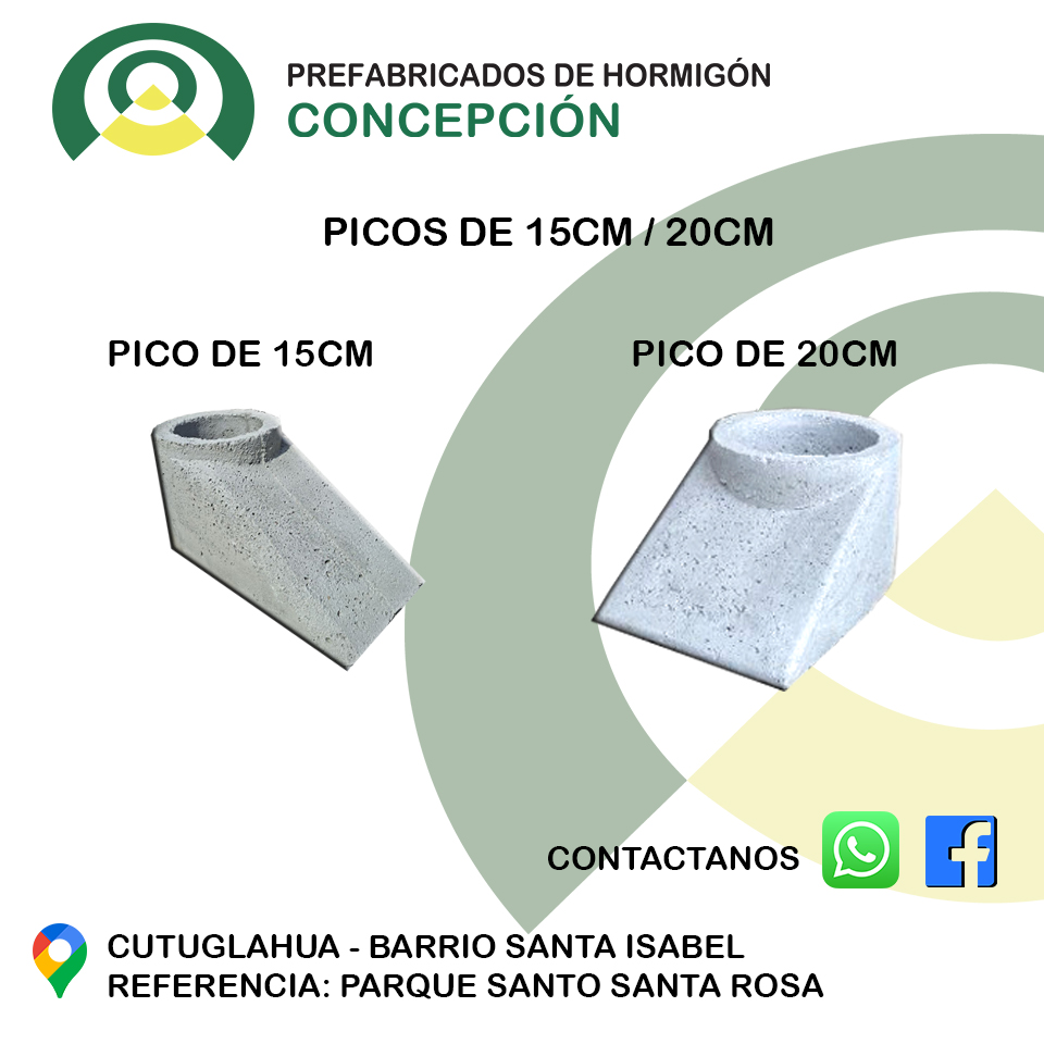Picos prefabricados de hormigón para conexión lateral en sumideros y drenajes. Disponibles en diámetros de 150mm y 200mm. Alta resistencia a la compresión y corrosión, instalación rápida y estanca con tubería estándar. Ideales para sistemas de evacuación de aguas pluviales y residuales en obras urbanas.